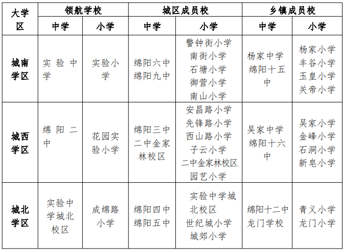 涪城区分为城南、城西、城北三大学区。为了促进教育公平,每一个大学区中都有一所领航学校和多个成员学校,学校之间互帮互助、共同发展。