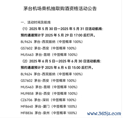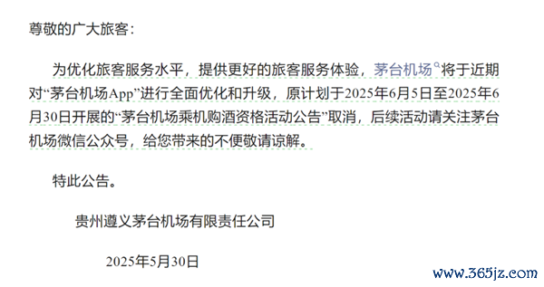 而在5月30日,遵义茅台机场微信公众号发布公告称:原计划于2025年6月5日至2025年6月30日开展的“茅台机场乘机购酒资格活动公告”取消。