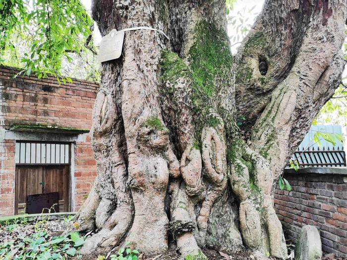 树干则更加粗壮,中间也挂着国家一级古树名木的铭牌,不知这两棵500年古树是否与明代的桐麻盐司或董家镇庙有关?