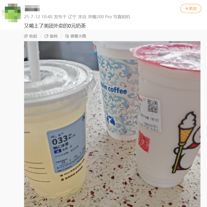 据报道,7月12日,、淘宝闪购等平台再次分别发放外卖大额券,不少网友晒图称喝到了0元奶茶。