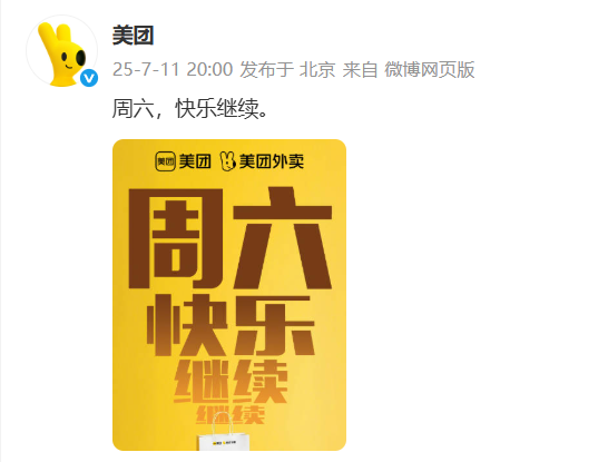 7月11日晚,@美团 发文称“周六,快乐继续”,预告今日新的一波外卖狂欢。