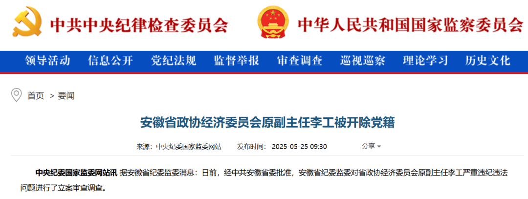 5月25日,中央纪委国家监委官网通报:安徽省政协经济委员会原副主任李工被开除党籍。