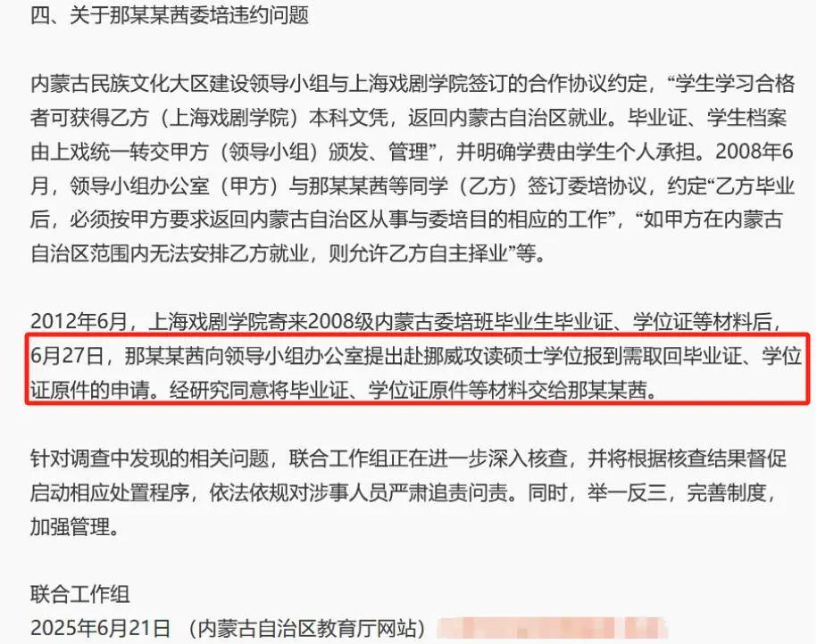 通报称那尔那茜与内蒙方面是签订了协议的:那尔那茜毕业后要返回内蒙工作,内蒙方面负责安排就业,如无法安排就业,允许那尔那茜自主择业。