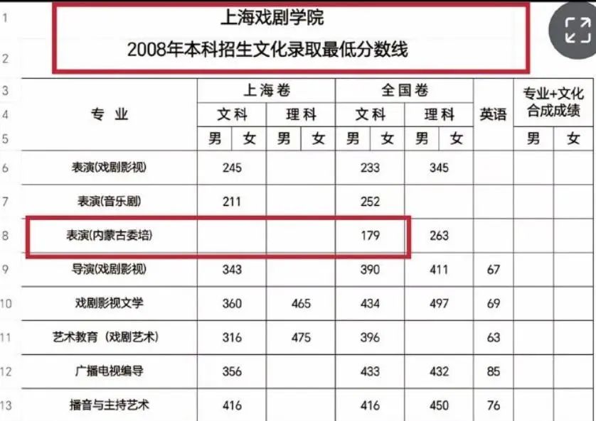 早前有网友放出一张上戏2008年录取分数线的截图,显示内蒙古委培文科的最低分是179分。