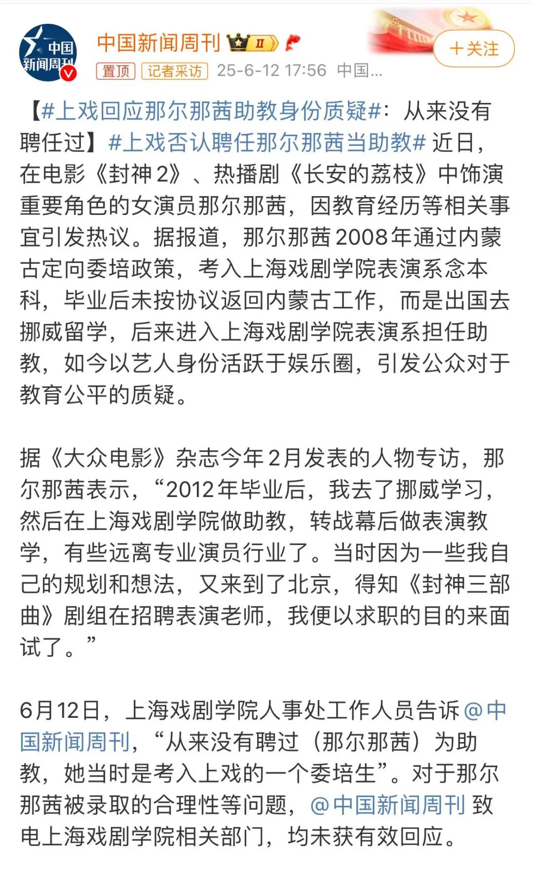 通报中只提到了上述几个问题,而关于那尔那茜是否是上戏的助教一事没有提及。