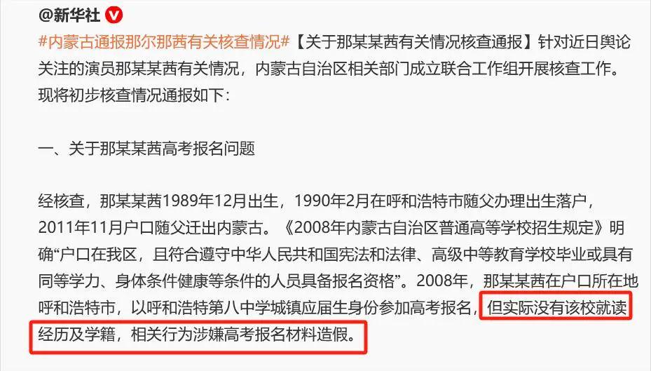 那尔那茜初中和高中都是在北京上学,但却是在内蒙古参加的高考,通报中称那尔那茜户口是在呼和浩特,直到2011年才随父亲迁出内蒙古。