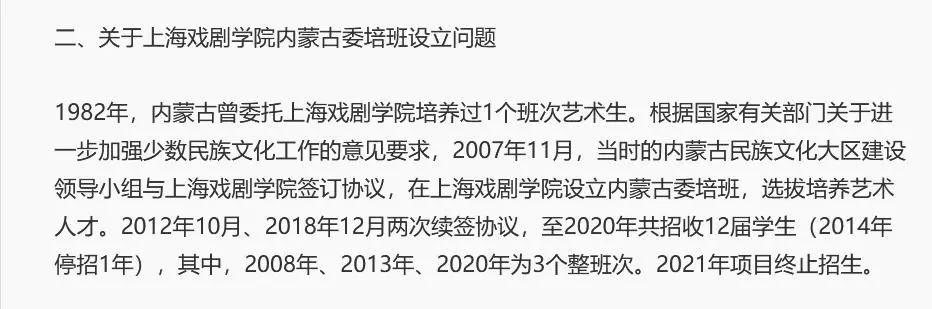 通报中只提到了上海戏剧学院到2020年共招收了12届学生,2021年项目终止招生,并未提及那尔那茜母女俩的具体情况,但似乎已经说明了这个班并不是专为她们而设。